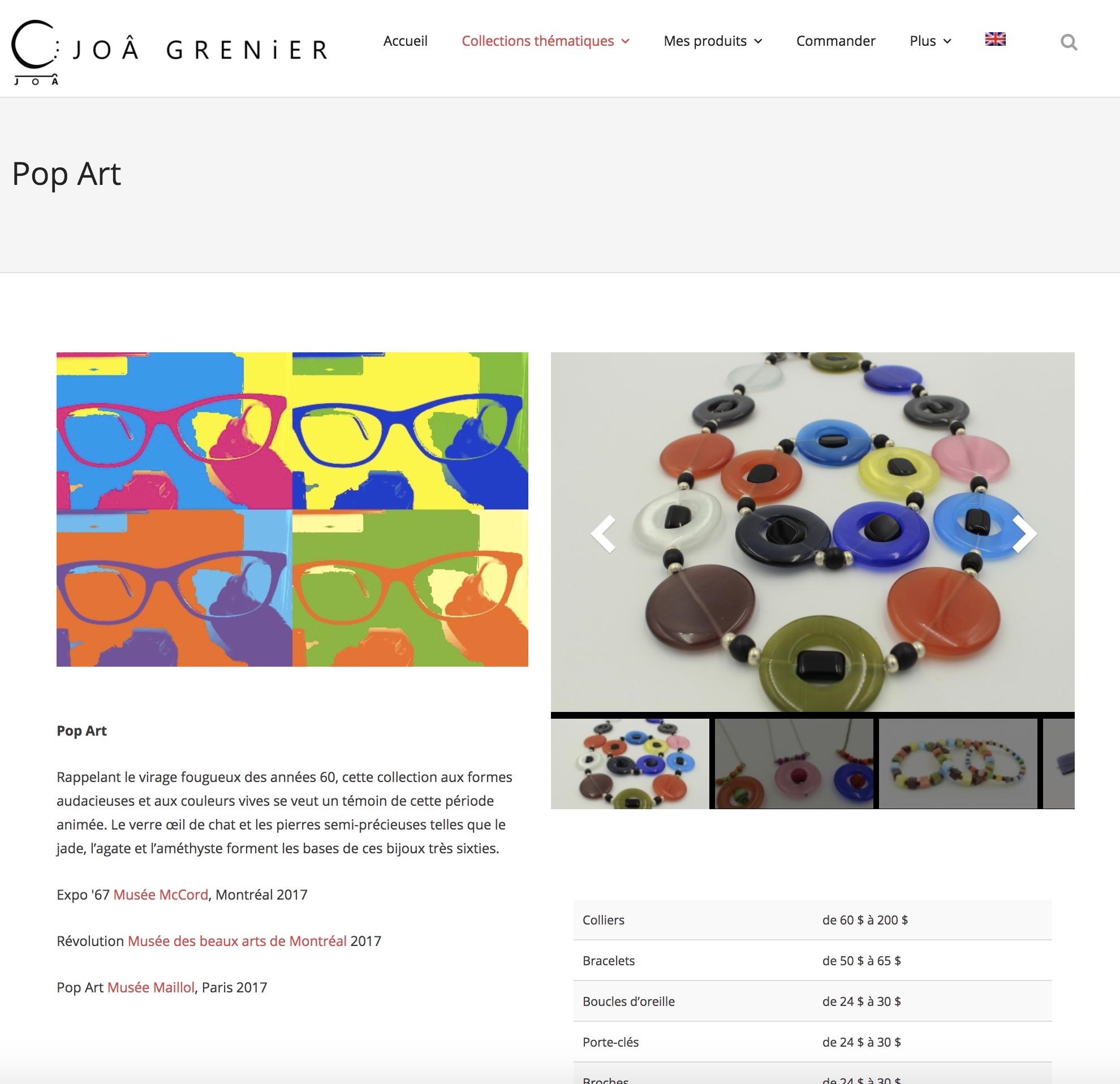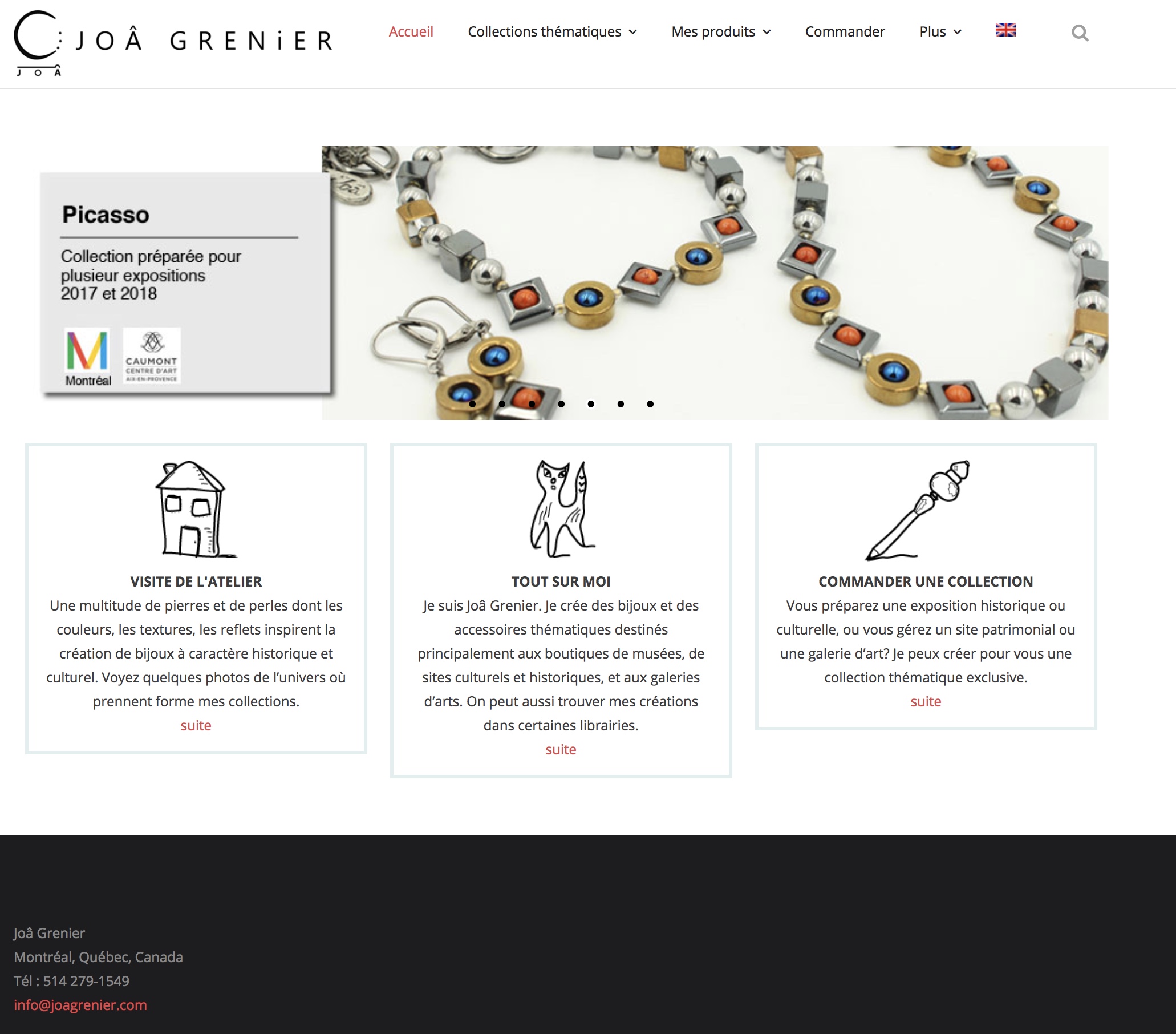 Joâ Grenier is a Montreal based jewelry designer. She designs theme-based jewelry and accessories for museum shops of cultural/historical sites. The objective of each collection is to capture the style and spirit of the exhibit and offer visitors a memorable keepsake. She needed a website to showcase and archive the multiple projects she works on every year as well as showcase her amazing talent...and of course, we couldn't resist giving a few tidbits about the paintings and art.